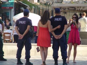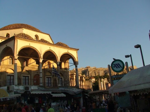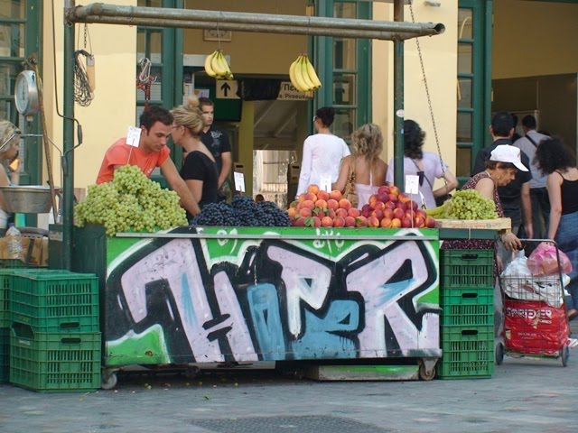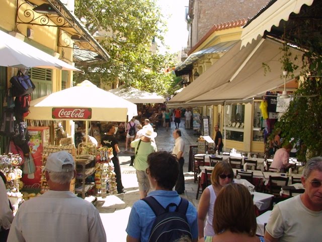 –Como já conhecíamos Atenas, pela manhã fomos simplesmente passear, misturarmo-nos com as pessoas. Beber um sumo de laranja. Desenferrujar o grego com empregados de mesa e comerciantes simpáticos. Este turismo sem agenda tem piada. ficamos um bocadinho menos turistas de ver as vistas e mais de conhecer as gentes. O almoço teve uma inevitável salada grega, azeitonas, pepino, pimento, tomate, queijo fetá, azeite e orégãos. Teve também uma coisa deliciosa chamada tzatziki. É uma espécie de iogurte muito fresco mas não doce, é avinagrado, tem pepino e alho migados e um pouco de azeite. E comemos souvlaki, uma espécie de espetadas com salada. E comemos moussaka que é como se fosse uma lasanha mas em vez de massa é feita com puré de batata, pão, beringelas, courgettes e cenouras, tudo cortado a fazer um empadão. Bebi cerveja grega. É mais leve e menos saborosa que a nossa. Não bebi café. O café bebe-se em casas específicas para o efeito. Beber café num restaurante é pouco prudente. Normalmente não presta.