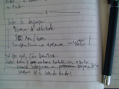 Há outra coisa oficial. Estou receoso. Pronto, confesso, completamente acagaçado. O tipo do altifalante e comandante da lata, que há-de ser tão humano e falível quanto eu, disse no melhor inglês que conseguiu que íamos encontrar alguma turbulência. Ora, alguma turbulência, no meu limitado vocabulário de acagaçado, não inclui solavancos de fazer saltar na cadeira nem latas a bater por todo o lado. Espero, sinceramente, ter oportunidade de um dia mostrar estas linhas a alguém. Era bom sinal. Como é que consigo escrever durante o episódio? Simples, isto sai tudo torto mas ajuda a esquecer um tudo-nada a lata aos saltos no vácuo.