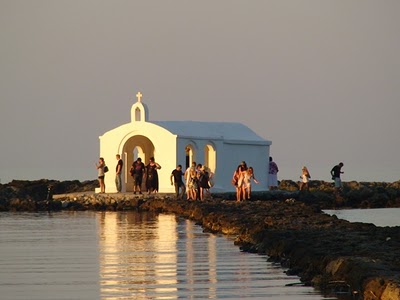 Quero registar outro aspecto. A genuína e exuberante simpatia dos cretenses. Não é uma coisa forçada, para turista ver. Eles são mesmo simpáticos e calorosos e desinibidamente tácteis. Já hoje, por duas vezes, pessoas que eu não conhecia de lado nenhum me deram uma palmada nas costas como forma de saudação e riram-se comigo. Eu sou assim e integrar-me-ia bem com esta gente, mas sei bem, por exemplo, o quanto me estranham em Portugal. Nós somos boa gente mas mais prudentes a ver no que a coisa dá, a dar tempo de conhecer as pessoas. Estes são mais espontâneos. Eu gosto das pessoas de riso fácil e franco. Os cretenses são assim.