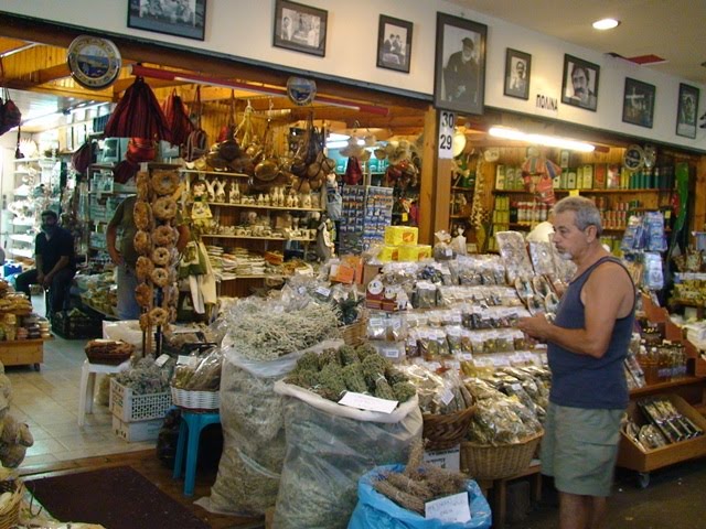 –Visitámos o mercado e verificámos que o conceito é mais amplo que o nosso. Além do peixe, da carne e das frutas, eles têm pastelarias, bares, lojas de roupa, de cerâmica, de livros e, claro, casas de queijo. E têm também casas onde vendem mel e plantas apanhadas nas montanhas de Creta com as quais fazem chá. Neste mercado, os ruídos são idênticos aos nossos, mas os odores são mais intensos. e marcam mais fundo.