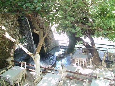 Estamos a tomar o pequeno-almoço. Não, não é tarde. Em Creta o pequeno-almoço pode ser entre as 11h. e as 13h. e o almoço pode ser até lá para as 15h. A hora do calor mais forte aqui é por volta das 16h. Ao meio-dia o tempo ainda é fresco. Estamos na sala de jantar de um restaurante sem paredes nem tecto, nem ar condicionado. À nossa esquerda e à nossa direita correm duas cascatas abundantes de água límpida por entre árvores frondosas. O fresco é natural. É um momento diferente e tranquilo. Bebemos café e comemos pão recheado com queijo e regado com mel.