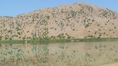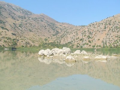 Às 9h. da manhã fomos ao magnífico lago Kournas. É um lago enorme no meio da serra. Tem duas cores. Azul muito escuro no centro e azul turquesa na orla. O lago é fechado a toda a volta. A água vem da serra e segue para o mar porque o lago, ao centro e no fundo, tem uma abertura natural por onde a água se escapa. Fomos ao banho no lago e em vez da água fria que esperávamos, encontrámos uma água límpida e morna. Foi espectacular.