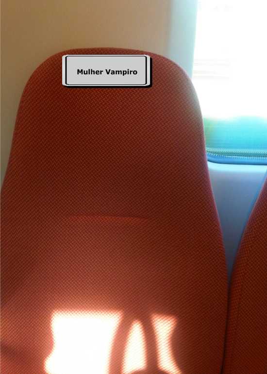 No meio da conversa agitada concluímos duas coisas. Primeiro, que a Mulher Vampiro ao fim do dia é completamente diferente. O oposto do que é pela manhã. Mas isso, já os leitores sabiam. Segundo, que ela é a mais característica personagem do Clã do Comboio. Todos nós sofremos mudanças e alterações. Todos nós mudamos de posição, todos nós alteramos a atitude. A Mulher Vampiro não. Ela viaja sempre no mesmo banco matinal e tem sempre a mesma atitude e adopta sempre a mesma posição. Bem vistas as coisas, a Mulher Vampiro é um ícone do Clã do Comboio. Vai daí, pedimos-lhe para se levantar, tirámos uma foto ao banco e fizemos a gracinha que pode ver-se na imagem abaixo. E porquê? Porque entendemos que a Mulher Vampiro tem direito a lugar cativo com carácter vitalício e personalizado.