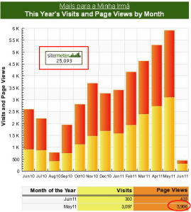 a numerologia estatística de “Mails para a minha Irmã” volta a surpreender. O mês de Maio quebrou, de novo, a barreira do mês mais visitado. Em Abril ultrapassámos as cinco mil visualizações tendo atingido as 5300, em Maio, o número de visitas subiu para 5906.