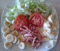 1 alface, 1 tomate, 1 banana, 1 maçã, 4 fatias de queijo pré-fatiado, de preferência mozarella, 1 embalagem de 250 gramas de bacon cortado aos bocadinhos. 2 Limões e 1 laranja.