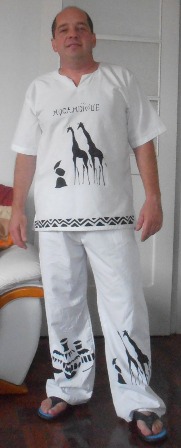 Fui comprar uma T-shirt e umas calças africanas, todas brancas com uns desenhos pretos, assim umas girafas e uns potes e coiso e tal: