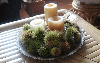 Disponha numa sala, de preferência a um canto, pois não queremos que o perfume da vela seja impositivo, nem que o ouriço da castanha rasgue a veste do convidado ou o fira num membro.