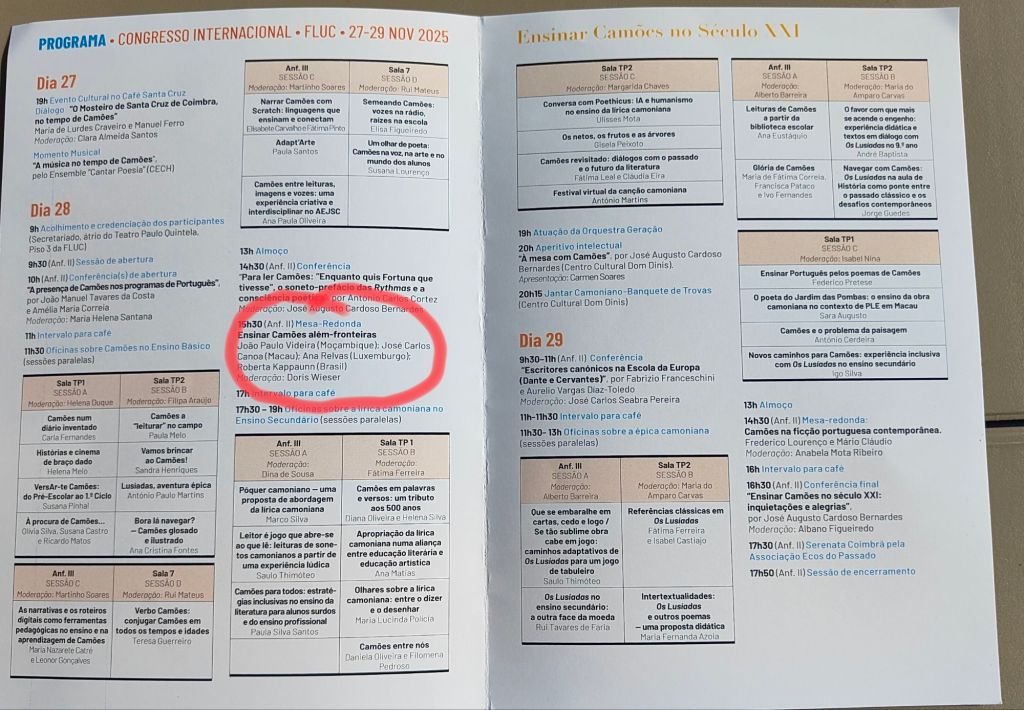 Nos dias 27, 28 e 29 de novembro teve lugar o Congresso Internacional Ensinar Camões. Foi um evento muito corrido, repleto de professores dos ensinos básico e secundário e também universitários. Duma vez só, atingimos dois objetivos diferentes. Vimos quem tínhamos de ver, antigos colegas e professores e apresentámos uma palestra que há muito desejávamos.