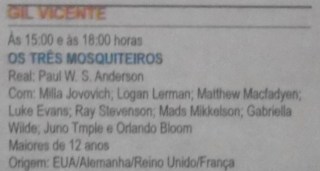 No domingo, comprámos o jornal e fomos verificar o que estava em cena e reparámos que o Gil Vicente está a passar uma fita muito recente e original: “Os Três Mosquiteiros”. Não, não está mal escrito, é assim mesmo. Parece que em Hollywood já estão a rodar a sequela que será “Os Quatro Repelentes”. Mai nada. Olha a prova aí em baixo!